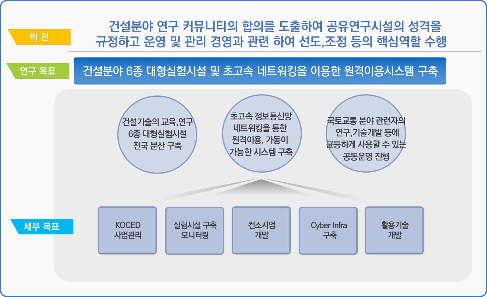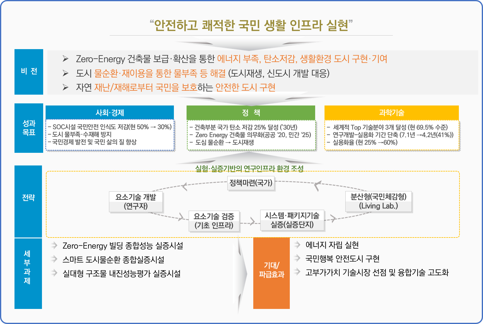 국토교통 신기술·R&D의 실용화·사업화 등 성과확산 및 선진국 수준의 기술력 확보를 통한 국민생활 안전 실현과 기술가치 창출을 위한 연구인프라 종합로드맵을 수립함