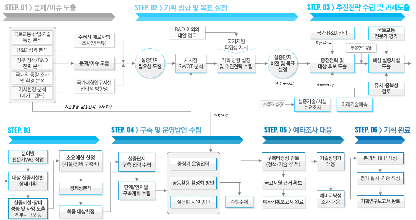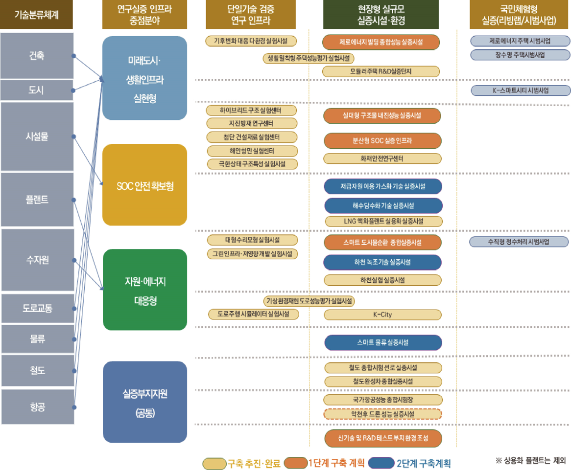 국토교통 R&D 기술의 빠른 실용화와 미래 신산업 창출을 위해 실제 또는 유사 환경에서 현장 검인증과 R&D정책·제도개선 등을 지원할 수 있는 실증기반의 첨단 융복합 연구인프라 조성사업을 기획함