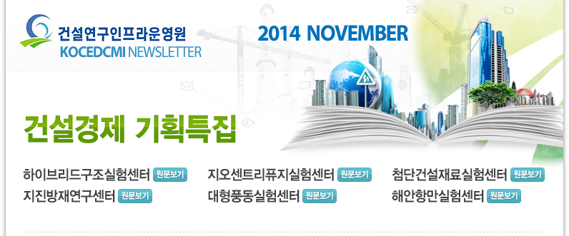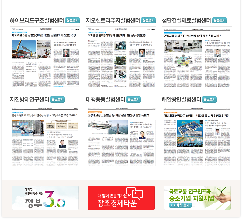 지오센트리퓨지실험센터 하이브리드구조실험센터 해안항만실험센터 첨단건설재료실험센터 대형풍동실험센터 지진방재연구센터 정부3.0 창조경제타운 국중소기업 지원사업 건설연구인프라운영원 원문보기